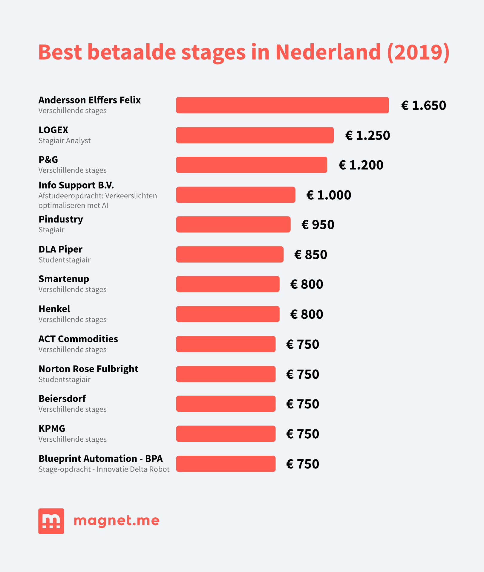 De best betaalde stageplaats van het jaar vinden we bij de management consultants van Andersson Elffers Felix in Utrecht. De stagiair in kwestie toucheert daar 1.650 euro per maand. De Stagiair Analyst bij de consultants van LOGEX doet daar niet veel voor onder, met een vergoeding van 1.250 euro per maand. Megaconcern Procter & Gamble biedt zijn beste stagiairs 1.200 euro per maand. De meest opvallende stageplaats in de top-10 is een afstudeerstage bij Info Support B.V. in Utrecht, waar de stagiair werkt aan het optimaliseren van verkeerslichten met behulp van kunstmatige intelligentie. De beloning daarvoor bedraagt, naast ongetwijfeld een schat aan zeer toekomstbestendige ervaring, 1.000 euro per maand.